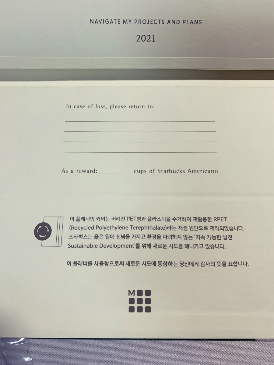 플래너에 들어있는 쿠폰을 제시하고 개인컵이나 텀블러로 음료를 받으면 동일한 음료를 즉시 지급해준다고 해요. 종이로 된 스트로를 사용하고 버려진 PET와 플라스틱을 재활용해서 다이어리 커버를 만드는 등 환경을 생각하는 스타벅스 답게 좋은 취지의 혜택을 주는 것 같아요. 꼭 친구와 방문할 때 개인컵이나 텀블러를 챙겨가면 좋을 것 같네요
