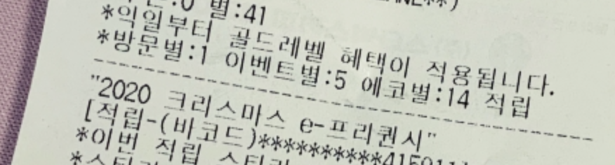 e-프리퀀시를 적립하면 별 적립을 하지 못해서 아쉬웠는데, 올 한 해 동안은 기프티콘을 선물하면 결제 한건당 별이 하나 적립이 되어요. 그래서 에스프레소를 14번 나에게 선물하기를 하면 하면 별이 일주일 뒤에 14개가 적립되어서 매우 이득이에요.