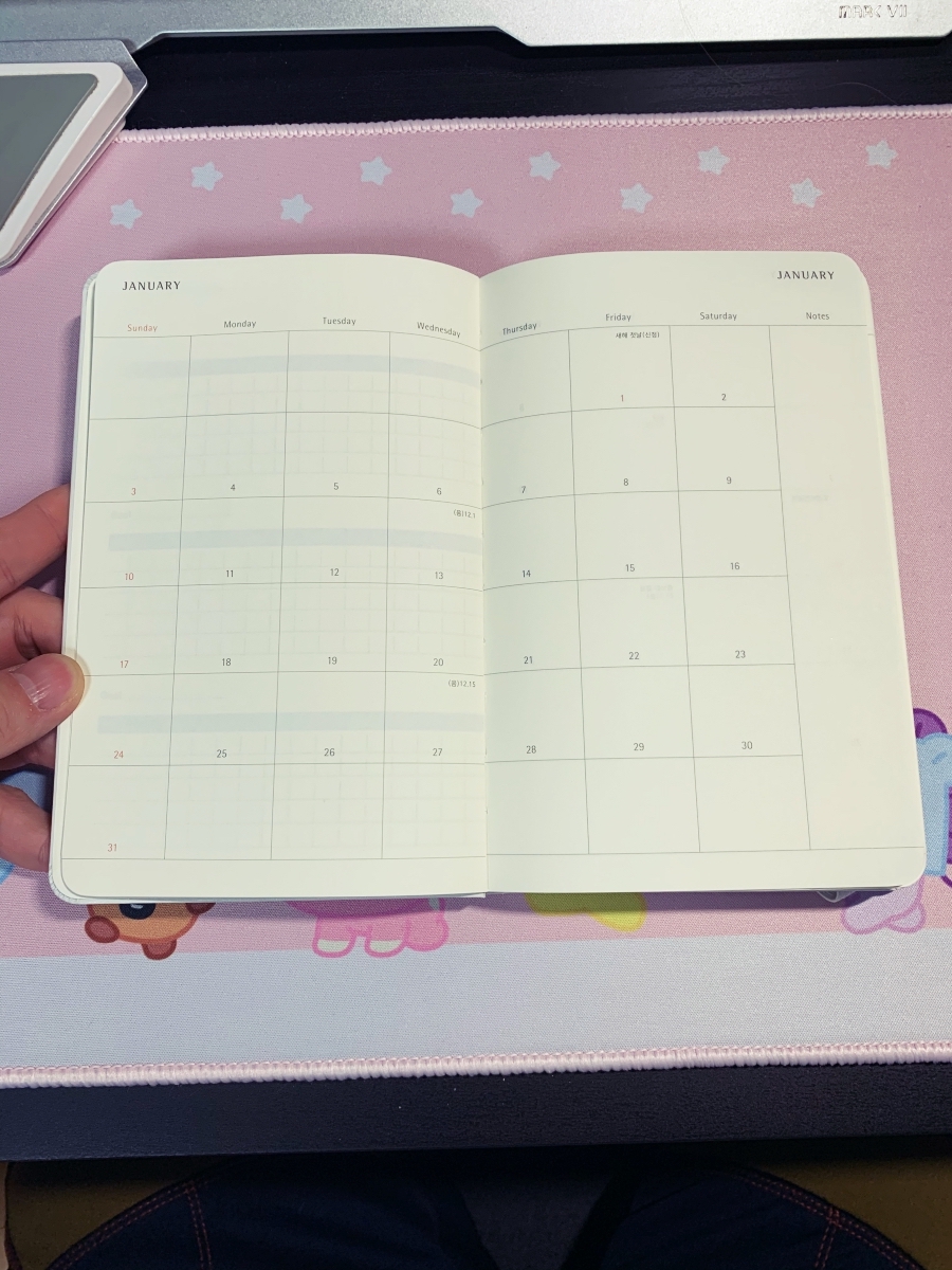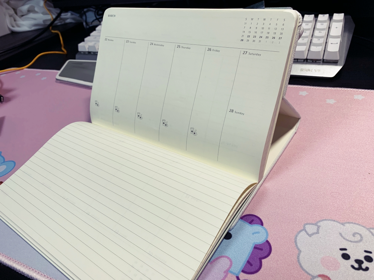 루틴 다이어리(미니)는 일반적인 다이어리와 동일한데 스탠딩 스케줄러(화이트)는 특이하게 세로로 보는 게 아니라 가로로 볼 수 있게 세워둘 수 있어요. 마치 아이패드에 커버를 씌워서 가로모드로 보는 것 같았어요. 센스 만점이네요