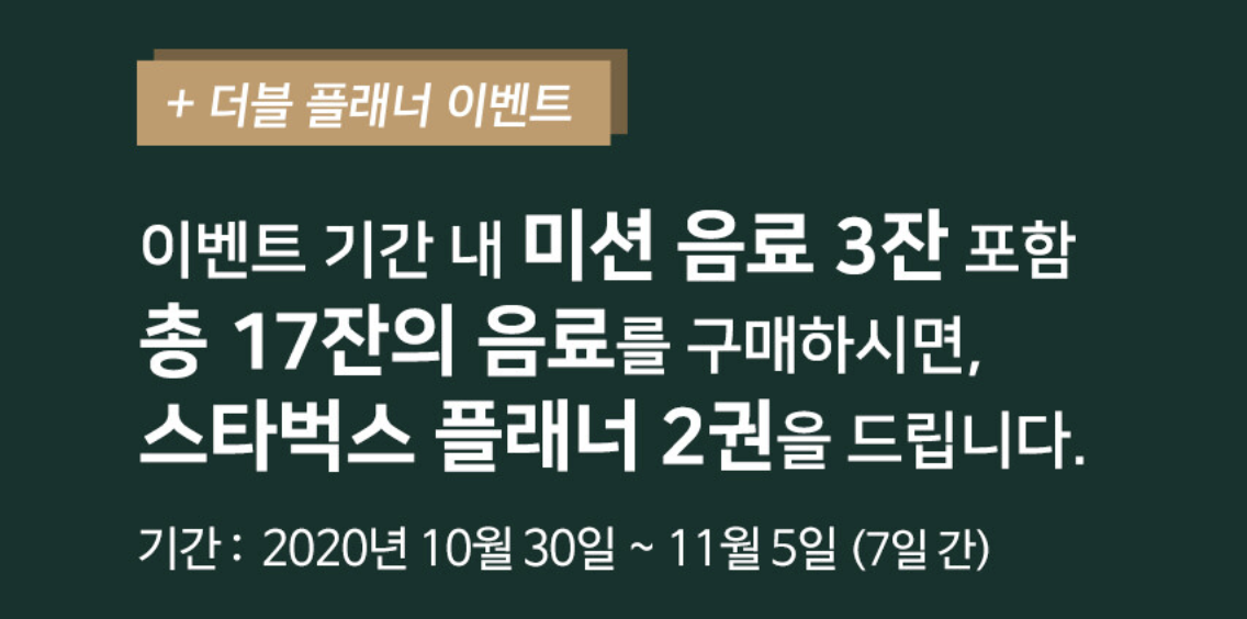 사실 에스프레소 14잔 신공을 알아보게 된 계기가 바로 스타벅스 플래너 1+1 이벤트였어요. 우연이 보게 된 이벤트 공지인데 바로 11월 5일까지 e-프리퀀시 쿠폰을 다 채우면 스타벅스 플래너를 추가로 한 개 더 준다는 거였죠. 오늘이 11월 4일이라 마음이 급해졌어요