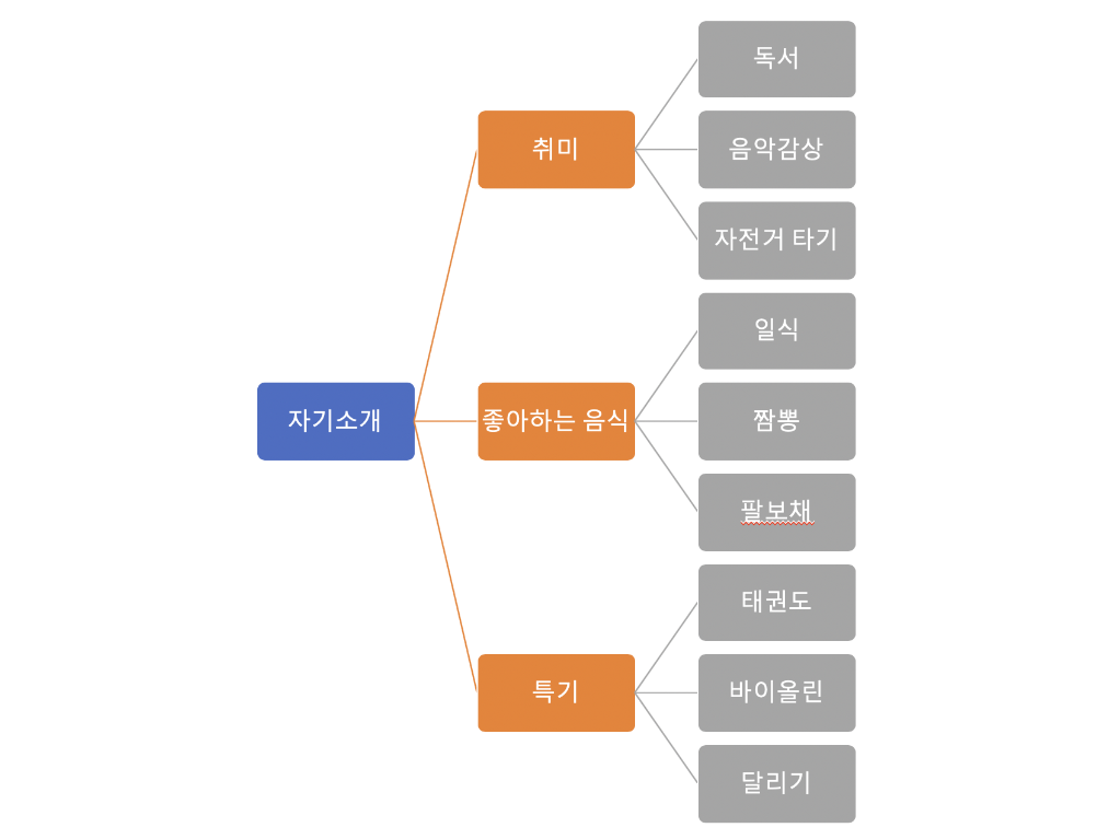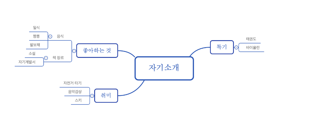 위에서 예를 든 마인드맵을 통해서 글을 쓴다고 하면, 주제는 '자기소개' 목차는 크게 특기, 좋아하는 것, 취미 등으로 챕터 3으로 작성할 수 있습니다. 이어서 세분화된 목차들에 대해서 자세히 설명하면 본문의 문단이 될 수 있습니다.
