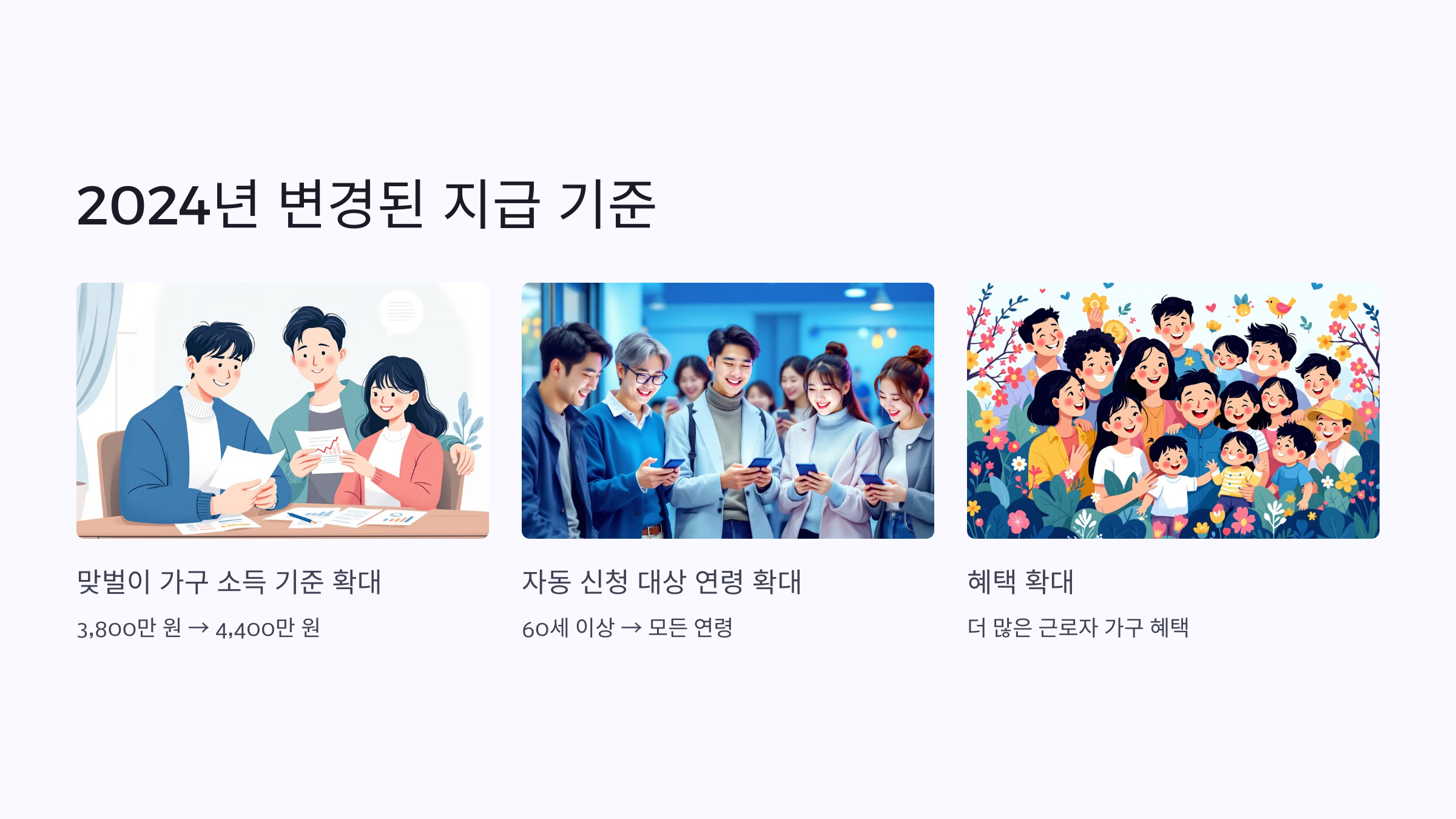 - 소득 상한이 높아져 더 많은 맞벌이 가구가 혜택을 볼 수 있게 되었습니다.
