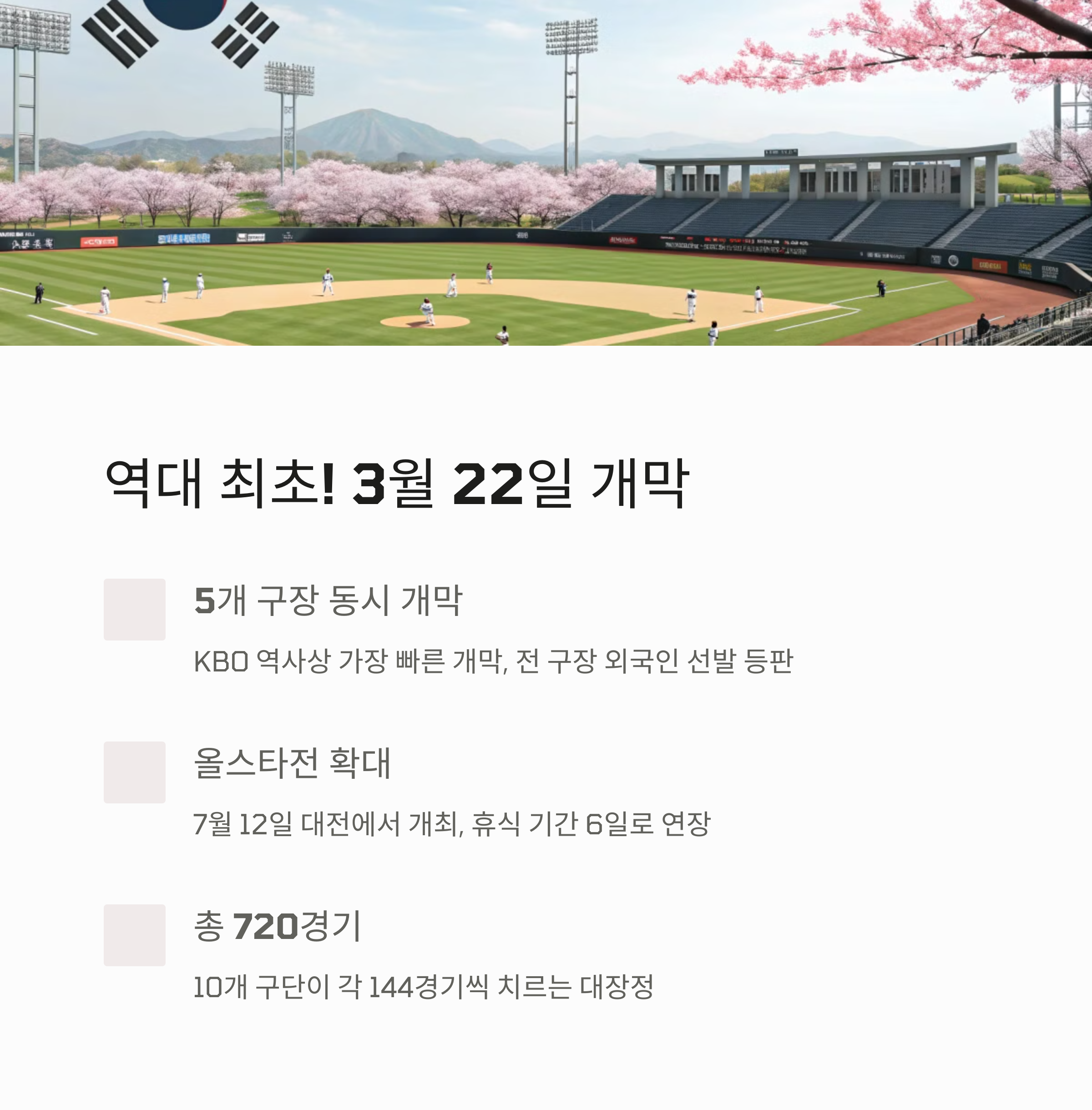 2025년 KBO 리그는 3월 22일 토요일, 역사상 가장 빠르게 개막합니다. 무려 5개 구장에서 동시에 개막전이 펼쳐지며, 개막전 선발 투수 전원이 외국인 선수로 예고되었죠. 이례적으로 따뜻한 봄 날씨가 예상돼 야구 팬들의 직관 욕구를 자극하고 있습니다. 이번 시즌은 총 144경기씩, 10개 구단이 총 720경기를 치르게 되며, 7월 12일엔 대전에서 올스타전이 열릴 예정입니다. 특히, 올해부터 올스타 휴식 기간이 6일로 확대되어 선수들의 회복에도 긍정적인 영향을 줄 것으로 보입니다.