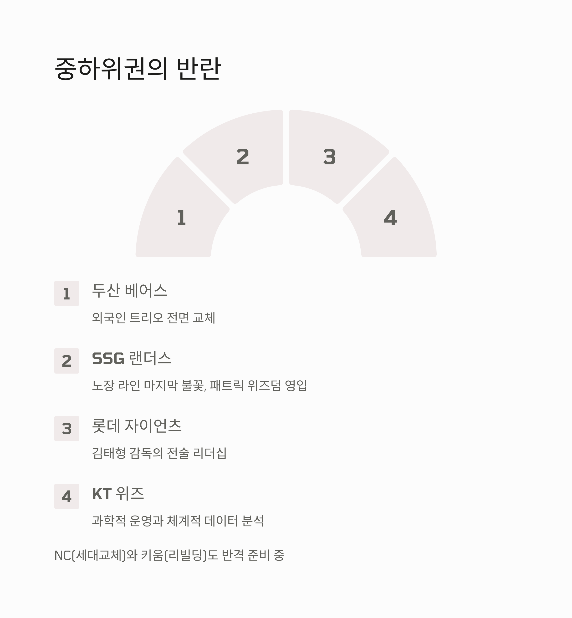 2025년 KBO 리그에서 중하위권으로 분류되는 구단들도 만만치 않은 반격을 준비하고 있습니다. 두산은 외국인 트리오를 전면 교체했고, SSG는 노장 라인에 마지막 불꽃을 기대하며 패트릭 위즈덤을 영입했죠. 롯데는 김태형 감독의 전술 리더십에 희망을 걸고 있으며, KT는 과학적 운영과 체계적인 데이터 분석을 바탕으로 치고 올라올 준비를 하고 있습니다. 반면 NC는 세대 교체 중이고, 키움은 리빌딩의 첫 단추를 꿰고 있는 단계입니다. 치열한 중위권 경쟁에서 생존할 팀이 누가 될지는 시즌 중반까지도 쉽게 예측하기 어려울 전망입니다.